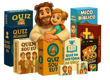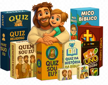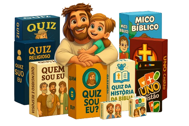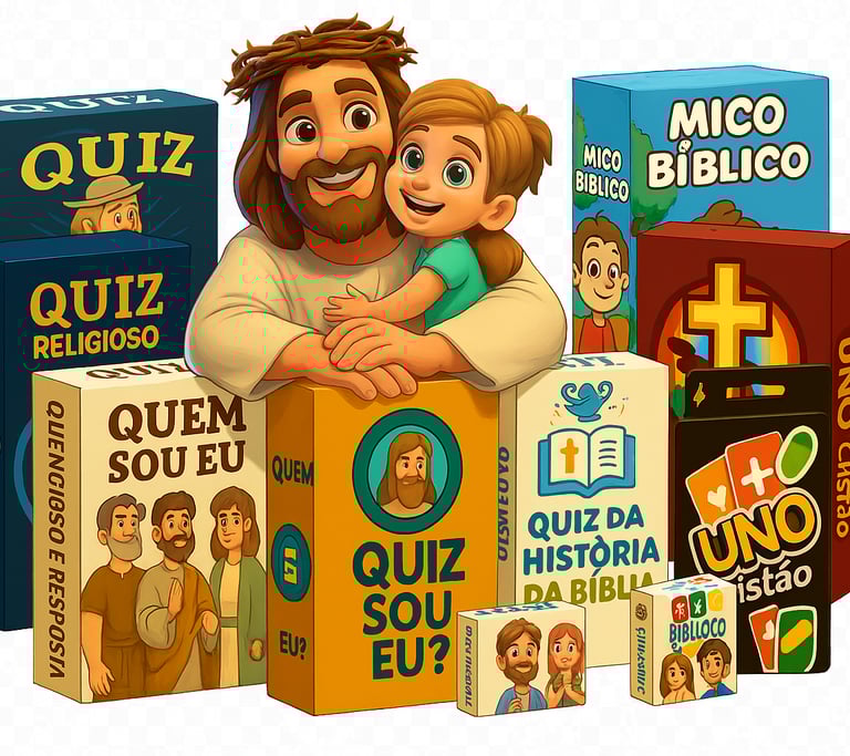 Com eles, crianças aprendem histórias bíblicas, valores e virtudes através de jogos como Quiz Bíblico, Mico Bíblico, UNO Cristão e MUITO MAIS...